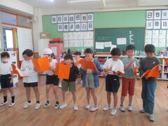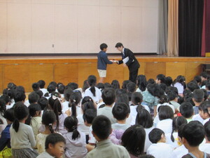 まず、大田区立小学校の教科作品展覧会に、馬込小を代表して図工の作品を出展した子どもたちの表彰です。おめでとうございます!