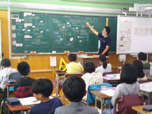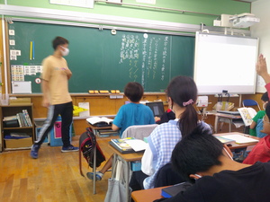 担任の先生やいつもの専科の先生に代わって、今日は専門的に外国語・外国語活動の研究に努めている1年担任の先生が教室に来て、授業を行っています。