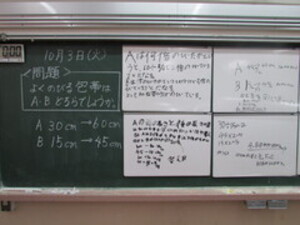 「どちらの包帯がよくのびるでしょうか」という問題について、子供たちが自分の考え方を発表しました。発表を通して自分の思考をアウトプットすることや、多様な考え方を知ることをねらいとしています。