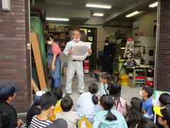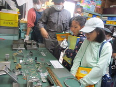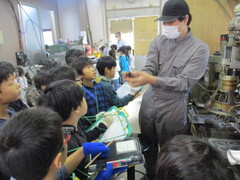 研磨されツルツルになった鉄板を実際に触り、職人さんの技に感動する3年生でした。