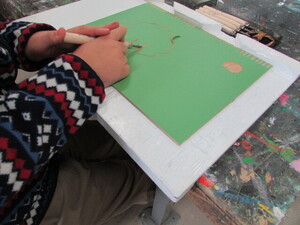 4年生は初めての木版画に挑戦しています。これまでの神版画と違い、彫刻刀を使って凹凸を作っていきます。