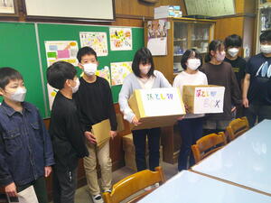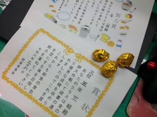 給食委員会が1月に「金の卵大作戦」という企画を行いました。食缶が空になった数を数えて集計をしました。各クラスに賞状を渡し。1,2,3位のクラスには金の卵も渡しました。この金の卵大作戦をした後から野菜をがんばって食べるようになったという人もいました。企画は終わりましたが、クラスで引き続きおいしく食べてもらえたらうれしいなと思います。