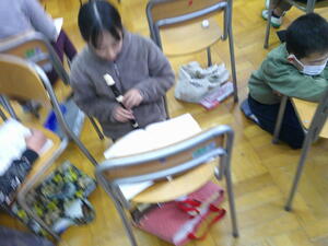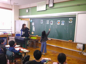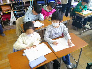 今日は、これまでの学習を生かして、自分で文をつくることにチャレンジしました。子どもたちは、意欲的に言葉探しをしています。難しい子は、先生からヒントカードを受け取って、こつをつかんでいました。