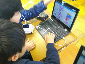 5年生の理科では「電磁石の性質」について学習しています。今日はそのお楽しみの日!実験キットで電磁石の性質を生かしたロボットを作って楽しむ時間なのです。電磁石の性質を生かしているポイントとしては「シュート機能」と「モーターの仕組み」です。ロボットを使ってサッカーをしたり、帽子取りをしたりして楽しみました。「もっと強くシュートをするにはどうしたらいいのかな。」「改造できないかな。」などの声も聞こえてきました。