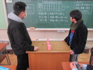 授業の終わりには立体早取りゲームをしました。出題者の児童が側面・頂点・辺の数を問題として出し、解答者の児童は正解の立体を相手よりも早く取ります。例えば「側面の数が6こ」という問題が出されたら「六角柱」を早く取った方が勝ちです。