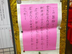 3月を迎えるにあたり、恒例のひな飾りを正門玄関に準備してもらいました。説明に書かれているとおり、大変由緒ある豪華なおひなさまです。