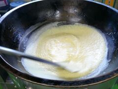 給食のおやこどんは、大きな釜で作ります。一度に入れると温度が下がりすぎてしまったり、たまごが固まりになってしまったりするので、少しずつ卵をいれています。ふわふわの食感や出汁のうまみが好評でした。