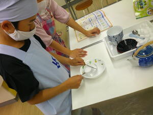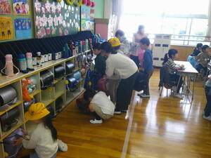 こんな時、頼りになるのが6年生。1年生が自分で上手にできるようになるよう、教えてあげたり手伝ってあげたりする様子が見られました。