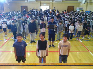 今日の全校朝会は1・3・5年生が体育館に集合、2・4・6年生はリモート参加でした。1年生が、初めて体育館の朝会に参加しましたが、早く静かに並ぶことができてえらかったです。