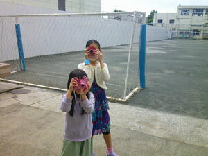 図工の時間につくったマイカメラを手に、4年生が校庭で被写体探しをしています。