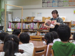 初めに読書学習司書の先生に、「かずあそび ウラパン・オコサ」という本の読み聞かせをしていただきました。1はウラパン、2はオコサで表します。馬が3頭だとオコサウラパン、9つの果物はオコサオコサオコサオコサウラパンになります。絵を見ながらみんなで楽しく数えました。