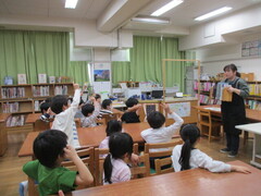 次に図書室の使い方クイズをしました。図書室では静かに過ごすことや本の並べ方を、クイズを通して学びました。