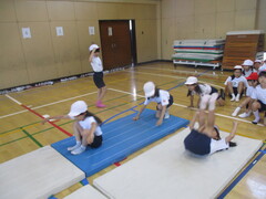 2年生の体育館体育では、「マットを使った運動遊び」をしています。今日は2年2組の体育館体育でした。