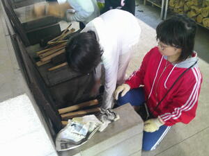 こちらは、かまどチーム…割り当てられた班のかまどでしっかりと火が燃えるように考えます。空気がよく入るようにするのがポイントです。