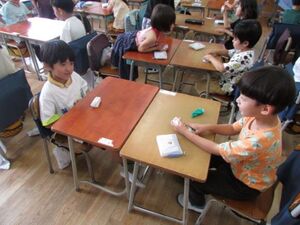 算数では、引き算の学習をしています。今日は計算カードを使って、お互いに問題を出し合い、計算の力を高めました。