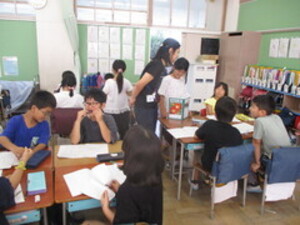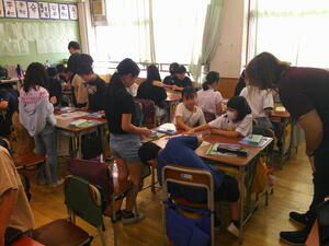 中学生が職場体験に来てくれました。3日間という短い期間でしたが、6年生のところにもたくさん来てくれて、勉強を教えてくれたり、中学校での生活について質問に答えてくれたりしました。来てくれた3人の中学生は、白坂先生や金子先生、山崎先生、住友先生の教え子でもあり、先生たちにとっても思い出を懐かしむ素敵な時間となりました。