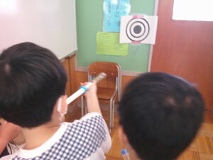 ペアで手渡された空気鉄砲を、試行錯誤しながらどうしたら同じように飛ばすことができるかを調べました。発射のときの様子を詳しくじっくり観察しようと、タブレットを活用するこどもたちも多くいました。