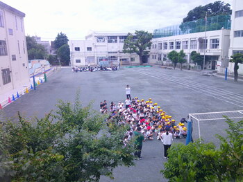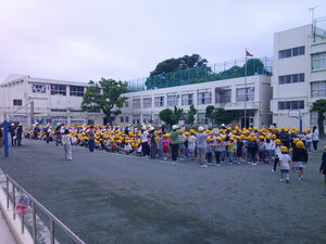 校庭、手前に1年、奥に6年