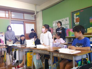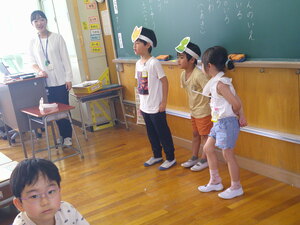 お昼に全校児童に向けた放送で一人ずつクイズを出したり、こどもたちの下校時にお見送りをしてくださったりと、日ごろの外国語・外国語活動の授業とは違った、英語に親しむ貴重な機会となりました。