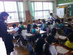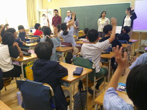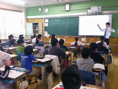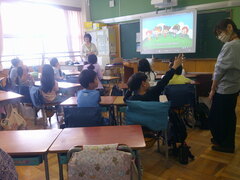 都の「外国語に触れる機会の創出」事業として行われる「イングリッシュ・キャラバン」… 本校にネイティブスピーカーの講師の方々が4名訪れ、4・5・6年の各教室で「ワールド・ツアー!」として、こどもたちが英語でのコミュニケーションを体験しました。講師の方々は英語で様々な国について楽しくプレゼンテーションをしてくださいました。どのクラスも、通訳なしの英語の話だけで、内容を理解しているようでした。はじめはちょっと緊張気味だった子も、だんだん表情がほぐれて大きく反応をしていました。カタコトでネイティブの方々に話すようなドキドキする経験は今後の学習に生きてくることでしょう。