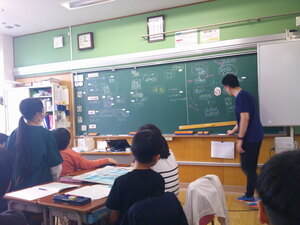 先生はファシリテーターとなってこどもたちからの意見を上手に引き出し、それらのつながりを整理しながら書きだしていきます。黒板全体が大きな一つの思考ツールとなり、班ごとに行う話し合いもますます活発に進められました。