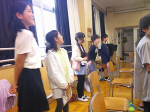 こどもたちが教室に集まるなり、すぐにウォーミングアップの既習曲「ビリーブ」と「おおブレネリ」を歌います。アイスブレイクのねらいもあり、体を動かす活動も入れてあっという間に楽しく和やかな雰囲気になりました。5年生のこどもたちのよさを引き出していて素晴らしい!