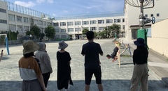 夏休みの校庭で、先生たちが鉄棒運動の勉強会をしました。
