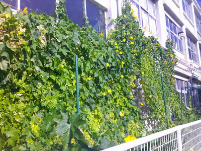 くわのき口ともみじ口の間の花壇に、今年も立派なグリーンカーテンができました。ヘチマの黄色い花もきれいに咲いています。