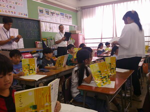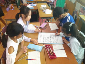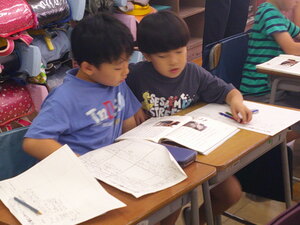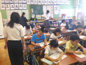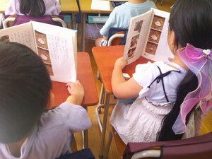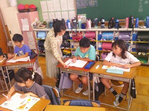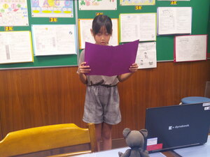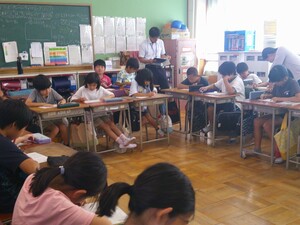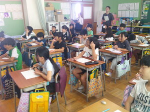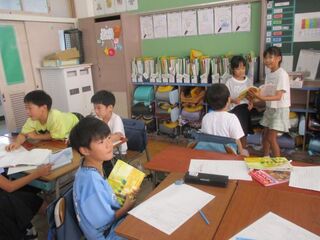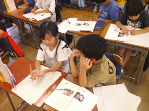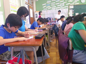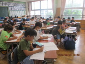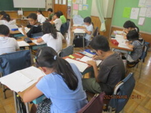 3年生は、現在、読書感想文にチャレンジしています。あらかじめ、読書感想文で書きたい1冊を夏休み中に選び、心に残ったところをメモしていました。本から学んだことや自分の思いを作文用紙に書きました。本番用の原稿用紙に書くときは、いつもより字をていねいに書いていました。書き終わると、どの子も笑顔になっていました。頑張りました。