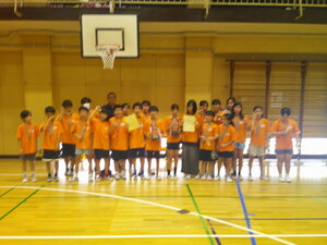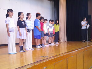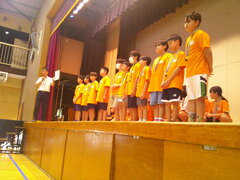 今日の朝会では、大田区ミニバスケットボール連盟主催の夏季交歓大会「東京羽田ヴィッキーズカップ」で、見事男女とも優勝を果たした馬込ミニバスケットボールクラブのこどもたちの紹介と表彰が行われました。