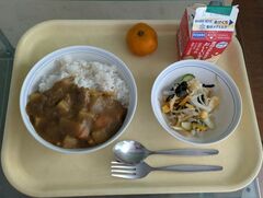 給食の献立:カレーライス、わかめサラダ、れいとうみかん、牛乳