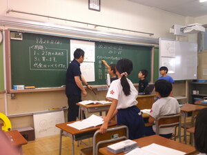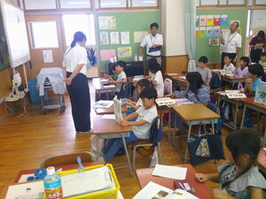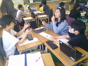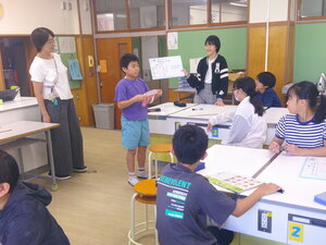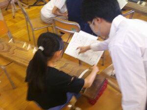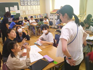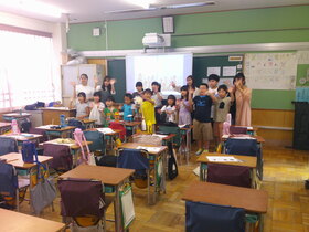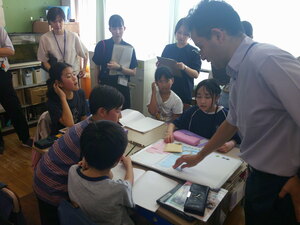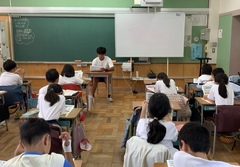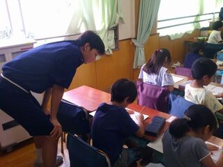 1年生の教室から順番に授業サポートに入り、教員の仕事の様子を見学するとともに先生としての仕事を体験します。こどもたちは、中学生のお兄さんがきてくれて大喜びで色々な話をしていました。中学生たちは、こどもたちのサポートの仕方に戸惑っている様子もありましたが、段々と緊張もほぐれ上手にサポートしていました。