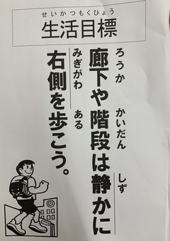 代表委員会では、全校のみんなが安全に気持ちよく過ごせるように「廊下や階段は、静かに右側を歩こう」という目標に取り組んでいます。