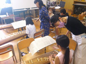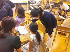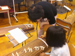 おことも初めて、おことの楽譜を見るのも初めてなので、ゆっくりゆっくり「サ… ク……… ラ」とがんばっていました。先生方や保護者の方々も、手取り足取り。
