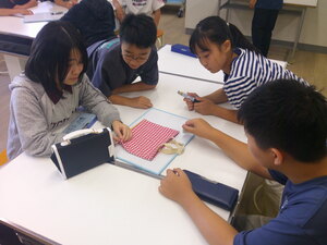これは難しい! でもみんな、知的好奇心がくすぐられるのでしょう。裏返してしくみをよく調べたりあちこちの長さを測ったり、真剣に考えていました。