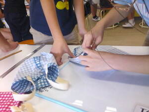 6年生は、布を用いて袋を製作する予定です。この時間は、すでにできあがっている見本をよく見て、1枚布の展開図を予想してみました。算数ですでに立体図形の展開図を学習しているので、その考え方を実践的に活用する良い機会です。まさにこれも教科横断的な学びといえるでしょう。