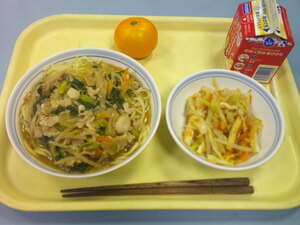 まごめみそラーメン、こんにゃくとあぶらあげのあえもの、くだもの(みかん)