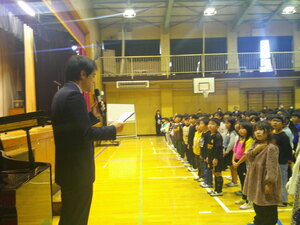 児童代表の言葉は1年生。広い体育館、たくさんのこどもたちの前で、自分の振り返りやこれからがんばりたいことを堂々と発表しました。頼もしい!