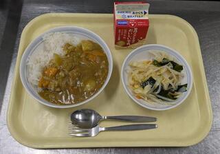 給食の献立:カレーライス、わかめサラダ、牛乳