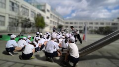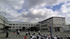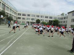 昨日こどもたちが下校した後、教師が校庭に50m走のコースを引きました。今日から各学年でタイムの測定が始まりました。スタートは5年生です。教師の説明の後、4人1組になってきれいなコースを走ります。2組の走りを見届けてから出張に出かけました。