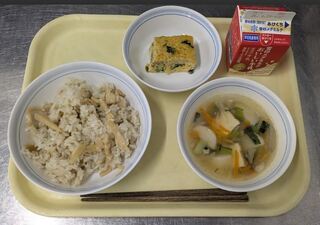 給食の献立:たけのこごはん、ほうれんそうのたまごやき、さわにわん、牛乳