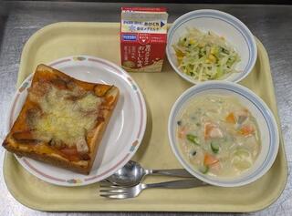 給食の献立:ピザトースト、アスパラガスとさけのクリームシチュー、コーンサラダ、牛乳