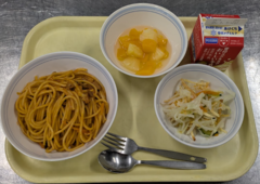 給食の献立:スパゲッティナポリタン、カリカリポテトサラダ、フルーツポンチ、牛乳