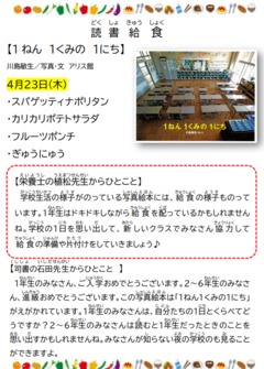 図書室にある「1ねん1くみの1にち」という本とコラボした給食です。給食の時間に給食当番をがんばる1年生が、スパゲッティをもりつけています。今日の給食も1年生も含め、当番さんががんばって盛り付けをしてくれました。給食はみんなで協力して準備や片付けをしていきましょう。