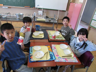 今日は給食時間に1年生の教室に行きました。小学校で食べる給食はまだ8回目ですが、ご覧のように成長が著しいです。「いただきます」の後、隣の席の友達と顔を見合わせておいしそうにパンをほおばる姿がほほえましく映りました。