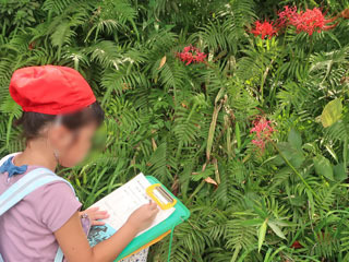 到着後は、「班で挑戦!秋探しビンゴ」を行い、赤色の葉っぱ、木の実、花、