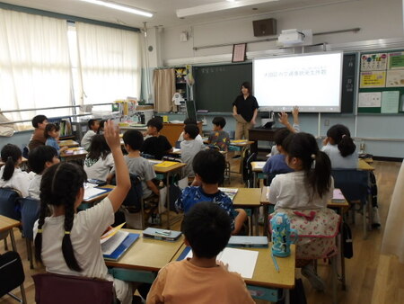 1校時の3年生の教室です。社会科の学習をしています。交通事故を防ぐという単元です。大田区の人口の推移と交通事故の推移のグラフを見ながら、交通事故が減ってきているのは、多くの人の工夫や努力があるのではないか?という課題をたて、今後の学習につなげていっています。