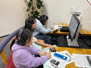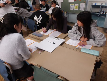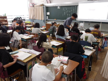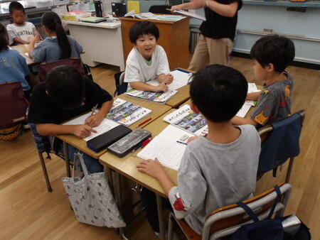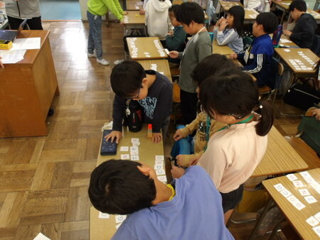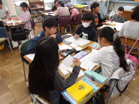 4年生の教室です。国語の学習をしています。同じ読み方の漢字の学習です。先生が例題を出し、漢字には同じ読み方でも意味の違う感じがあることを知り、自分たちで同じ読みの漢字を辞書で調べています。そして調べた漢字をグループで共有しています、