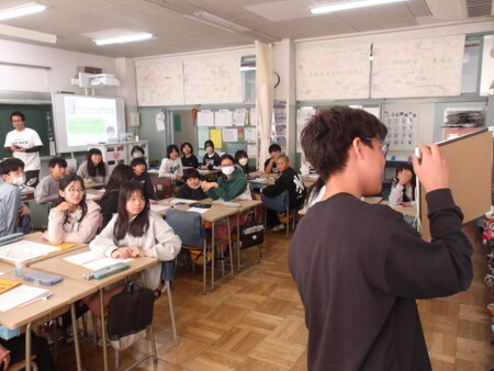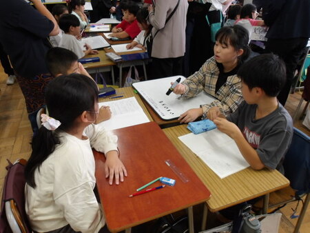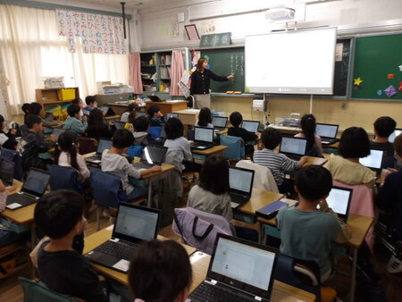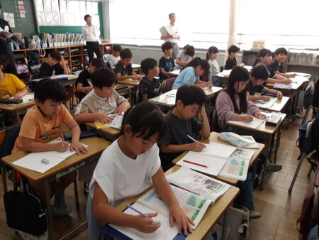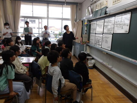 5校時の4年生の教室です。総合的な学習の時間です。4年生は、防災について学習をしています。ゲストティーチャーの話を聞いたことで、自分たちにできる防災対策について考えています。グループで話し合った後、全体で確認しています。次時は、さらに内容を検討していくようです。今日は、校内研究日なので、全教員が授業を参観しています。