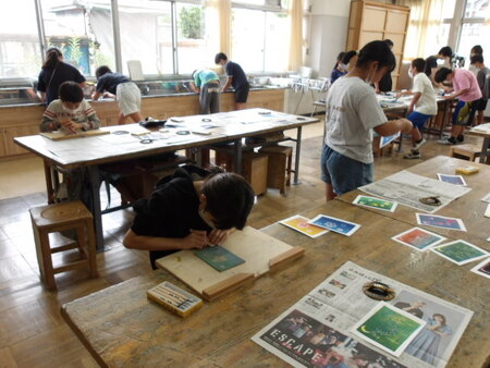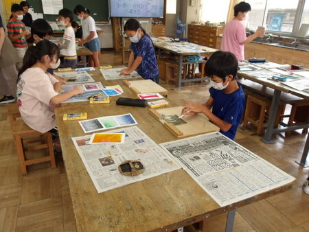 3校時の図工室です。5年生が、図工の学習をしています。版画の学習です。一度彫った版画を刷り、また、版画を彫り進め、刷った絵に重ねていくという教材です。彫り進めていくうちに、版画の模様や色が重ね合わさって、きれいな版画になっています。一人一人が思い思いの作品作りをしていてすてきな作品になってきています。